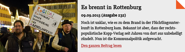 Im September hat eine Flüchtlingsunterkunft in Rottenburg gebrannt. Kontext hat darüber berichtet. Und über das Engagement der örtlichen SPD. Die hat sich zum ersten Mal gegen die Zündler des rechten Kopp-Verlags zur Wehr gesetzt.