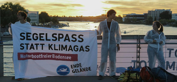 Zum Seenachtsfest machten Anfang August wieder zahlreiche Motorboote in Konstanz fest. Die Klimaschutzgruppe "Ende Gelände" nutzte den Motorboot-Ansturm, um auf den schädlichen Beitrag der Hobby-Skipper zum CO2-Ausstoß aufmerksam zu machen.