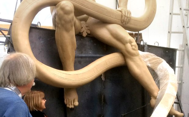 Exklusiv in Kontext: das erste Foto vom S-21-Laokoon aus dem Atelier von Peter Lenk. Nur der Kopf fehlt, er bleibt noch geheim. Jetzt geht's um die Finanzierung. Ein Besuch beim Skandal-Bildhauer in Bodman, wo einem wieder mal das Lachen im Hals stecken bleibt.