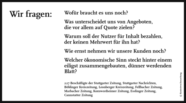 Ein Akt der Verzweiflung, ein Hilferuf? Auf jeden Fall ein Manifest gegen eine Manager-Riege, die eine "historische Umwälzung" will und nicht weiß, was sie tut. Dagegen wehren sich 227 Beschäftigte im Stuttgarter Pressehaus mit einem Brief in bisher einmaliger Schärfe.