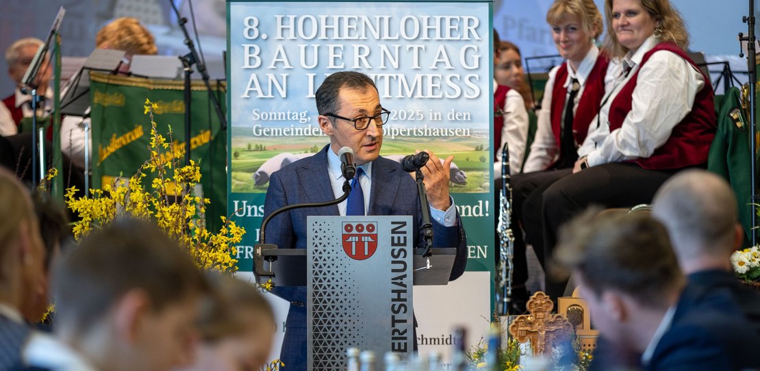 Auf dem Hohenloher Bauerntag beharken sich Grünen-Minister Cem Özdemir und CDU-MdL Sarah Schweizer, obwohl das Thema doch Frieden war. Und dann wurde der Wolf aus dem Hut gezaubert.