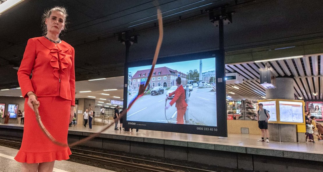 Die Künstlerin Nana Hülsewig domptiert die Automassen auf dem Stuttgarter Charlottenplatz. Dabei geht es ihr nicht nur um Mobilitätsalbträume, sondern auch um feministische Fragen. Bis Freitag wird das Video der Aktion öffentlich gezeigt – obwohl diese fast vom Ordnungsamt verhindert worden wäre.