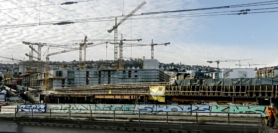 "Ich glaub, mich knutscht ein Bagger", für Fußgänger und Radfahrer in der Stuttgarter City sind Begegnungen dieser Art nichts Außergewöhnliches. Kommen sich Bauarbeiter und Passanten beispielsweise im Gerberviertel seit Jahren näher als unbedingt gewünscht. Seit Anfang 2011 wird hier am Südende der City an einem neuen Einkaufs- und Bürozentrum gebaut. Der Finanzdienstleister Wüstenrot & Württembergische-Gruppe investiert 250 Millionen Euro ins "Gerber". Am anderen Ende der Innenstadt, im neuen Europaviertel, entsteht ein noch größeres Einkaufszentrum. 500 Millionen Euro werden im "Milaneo" verbaut. Und gerade eben beginnen hinter dem Traditionskaufhaus Breuninger die Bauarbeiten für das neue "Dorotheen Quartier". Nicht zu vergessen: das Milliardenprojekt Stuttgart 21. Wie sich die Stuttgarter zwischen den Megaprojekten hindurchzwängen, welche Hindernisse sie überwinden, welche Provisorien sie passieren müssen, hat Kontext-Fotograf Joachim E. Röttgers dokumentiert. Die Bilder zeigen, dass die Menschen für die Stadt, die Stadt aber immer weniger für die Menschen da ist ...
