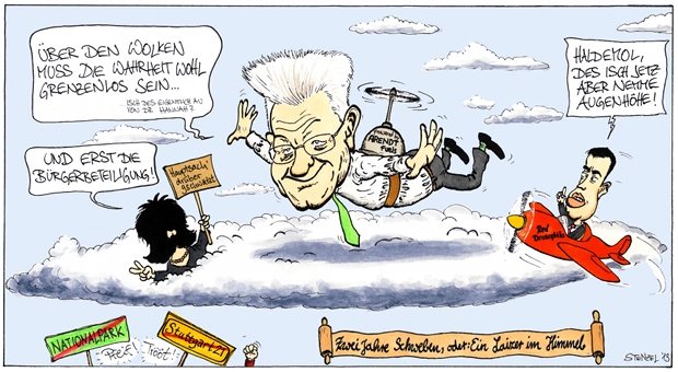 Doch Vorsicht. Dass es mit den MP-Mirakeln nicht so weit her ist, belegt der Fernsehjournalist und Politologe Dietrich Krauß. Er weist Kretschmann nach, dass er seine hoch geschätzte Philosophin zur bizarren Karikatur macht - wenn er sie als Kronzeugin einer Demokratie- und Wahrheitstheorie anführt. Und wo ist das sinnfälliger als bei Stuttgart 21?