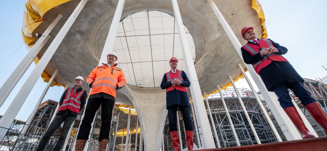 Die Bahn feierte Bergfest für das S-21-Bahnhofsdach, denn 14 von 28 Kelchstützen sind fertig. OB Frank Nopper und Architekt Christoph Ingenhoven grinsten um die Wette, die Sonne strahlte auch.