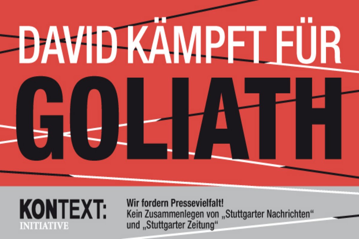 Kontext wirft sich für die "Stuttgarter Zeitung" und die "Stuttgarter Nachrichten" in die Bresche. Das mag auf den ersten Blick erstaunlich sein. Ist es aber nicht. In einer Zeit, in der immer mehr Redaktionen geschleift, JournalistInnnen auf die Straße gesetzt werden und die Verlegerprofite das Maß aller Dinge sind, muss dagegengehalten werden. Aus Prinzip. Darin sind wir uns mit fast 100 Unterzeichnern, darunter viele Prominente aus Stadt, Land und Bund, einig. Sie alle wollen Pressevielfalt und unterstützen deshalb den Kontext-Aufruf "David kämpft für Goliath". Wir wünschen uns, dass es – wegen der Bedeutung des Themas – noch mehr werden. Zur Aktion geht es <link http: www.kontextwochenzeitung.de _blank>unter diesem Link.