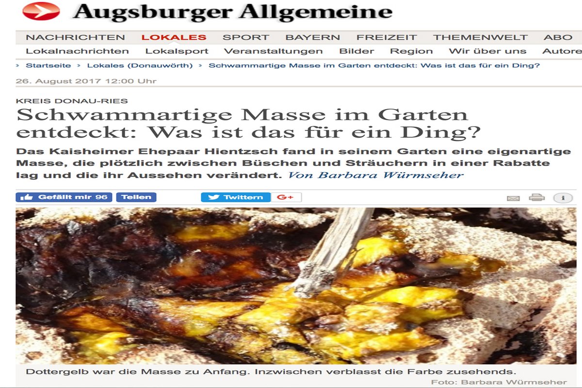 Übrigens, ohne jetzt selbstgefällig klingen zu wollen: Kontext bildet. Hätte das Ehepaar Hientzsch aus Kaisheim im Kreis Augsburg unser <link https: www.kontextwochenzeitung.de editorial bloeder-als-ein-einzeller-4549.html _blank external-link>Editorial von vergangener Woche gelesen, hätte es gleich gewusst, was für eine "schwammartige Masse" sich da in seinem Garten verlustierte. Die "Augsburger Allgemeine" titelte jedenfalls einigermaßen ratlos <link http: www.augsburger-allgemeine.de donauwoerth schwammartige-masse-im-garten-entdeckt-was-ist-das-fuer-ein-ding-id42495701.html _blank external-link>"Was ist das für ein Ding?" Selbst die örtliche Polizei tappte im Dunkeln und mutmaßte, "es müssen wohl Fäkalien sein, die aus einem Flugzeug heruntergefallen sind". Zwei Tage später gab die Zeitung Entwarnung – <link http: www.augsburger-allgemeine.de donauwoerth das-raetsel-um-die-schwammartige-masse-scheint-geloest-id42506396.html _blank external-link>Rätsel gelöst! Es war ein – na? Genau! – Schleimpilz. Für die Zukunft: Wir helfen gerne.