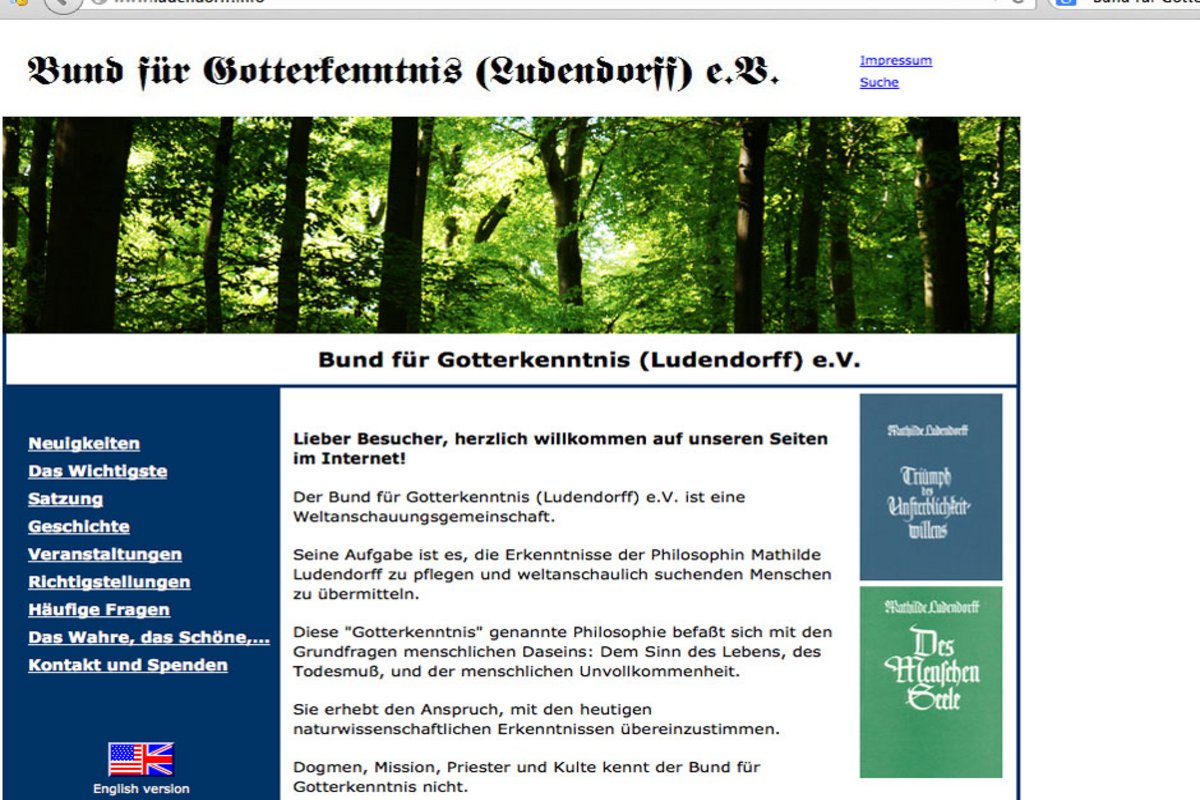 Der mehrere hundert Mitglieder umfassende "Bund für Gotterkenntnis" (BfG) bezeichnet sich als Weltanschauungsgemeinschaft. Praktiziert wird ein sektenhaftes Verhalten, Öffentlichkeit und insbesondere Journalisten sind bei Veranstaltungen unerwünscht. Der BfG sieht es als seine Aufgabe an, "die religionsphilosophischen Einsichten der Gotterkenntnis Mathilde Ludendorffs unter allen Menschen, die dafür aufgeschlossen sind, durch Wort und Schrift zu verbreiten und in der Gemeinschaft zu pflegen." (Satzung vom 1. Juli 2014) Gemeint ist eine krude Melange aus wirren antisemitischen und rassistischen Verschwörungstheorien, germanisch-heidnischen Glaubensansätzen mit ethnopluralistischen Vorstellungen und brauner Esoterik.