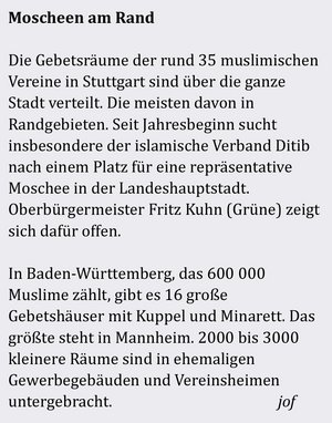 Wir brauchen eine repräsentative Moschee in der Stadt. Wir brauchen sie, damit die Bürgerinnen und Bürger islamischen Glaubens Raum und Platz haben, ihre Religion auszuüben. Zehn Prozent der Stuttgarter Bevölkerung sind Muslime, das sind rund 60 000 Menschen, die Bevölkerung einer Kleinstadt.