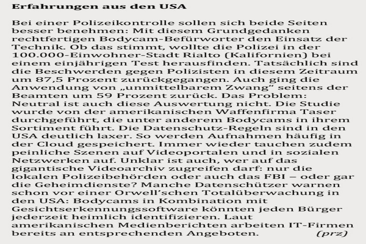In Hessen hingegen ist der Datenschutzbeauftragte zufrieden: Es gibt keine Tonaufzeichnungen, die Videos werden verschlüsselt gespeichert und auf einen PC ohne Internetanbindung überspielt. Um Mauschelei von Anfang an auszuschließen, dürfen sie nur von einem Vorgesetzten angesehen und, sofern keine Straftat vorliegt, gelöscht werden. In den USA scheint diese Regelung noch nicht einwandfrei zu funktionieren. Sowohl in New Orleans als auch in San Diego – beides Städte mit verrufenen Polizeibehörden – tragen Beamte schon länger Bodycams. Trotzdem sind selbst nach tödlichen Schüssen häufig keine Aufnahmen verfügbar, weil die Polizisten selbst entscheiden, wann sie filmen und wann nicht.