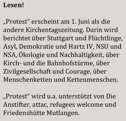 Der Arbeitsausschuss der Evangelischen Studentengemeinde (ESG) baute auf den Erfahrungen der katholischen Brüder und Schwestern aus Nordrein-Westfalen auf und nutzte sie beim Evangelischen Kirchentag in Stuttgart, um gesellschaftspolitische Diskussionen anzustoßen. Beschlossen wurde eine Zeitung "Pro-Test", die dann während des Kirchentags täglich erschien. Logistisch und organisatorisch war dies kein Problem, denn die Bundesgeschäftsstelle der ESG war damals in Stuttgart Bad-Cannstatt in der Mercedesstraße 2, direkt neben dem heutigen Kirchentagsgelände. Das Layout stammte von dem heute in Dresden wirkenden Grafiker Jochen Stankowski, der auch <link https: www.die-anstifter.de schlagwort protest-die-bewegungszeitung _blank>die neue "Protest" zum Kirchentag 2015 gestaltet.