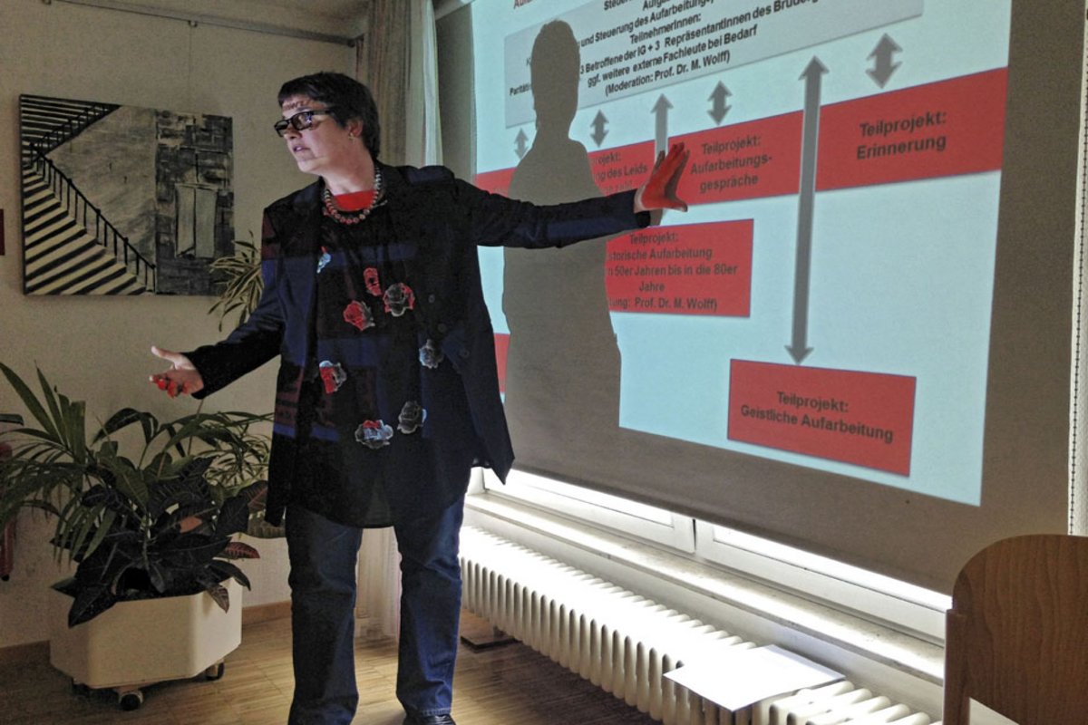 Es sind immer wieder neue Demütigungen wie diese, die auch beim nun fünften Opfertreffen Ende Mai im Korntaler Bürgertreff von der Erinnerung hochgespült werden. Eine Frau erinnert sich an den Besuch bei den amerikanischen Streitkräften und wie unangenehm ihr das war, immer bei Soldaten auf dem Schoss sitzen zu müssen. Zwei Männer ganz vorne in der Stuhlreihe tragen demonstrativ ihre weißen T-Shirts, auf denen in blutroten Lettern steht: "Missbrauchsopfer Hoffmannhaus Korntal." Das Leid, das sie als Kinder in den Heimen der Evangelischen Brüdergemeinde erlitten haben, ist inzwischen unbestritten.