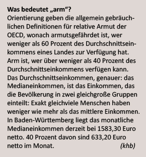 Für den Bericht untersucht wurde auch der Reichtum im Land – "Ungleichheitsforschung" nennen das die Sozialwissenschaftler. Nach Standard als reich gilt, wer mehr als das Doppelte des Medianeinkommens zur persönlichen Verfügung hat: Das sind in Baden-Württemberg 3166,60 Euro netto im Monat. Es wurde untersucht, wie viel vom Bruttoeinkommen den einzelnen Einkommensgruppen netto übrig bleibt. Sind die unteren Einkommen noch vergleichsweise gut dran mit 69 Prozent, die vom Brutto bleiben, so gehen bei mittleren Einkommensgruppen bis zu 45 Prozent des Einkommens für Steuern und Abgaben weg. Sehr reiche Leute haben 70 Prozent ihres Verdienstes zur Verfügung.