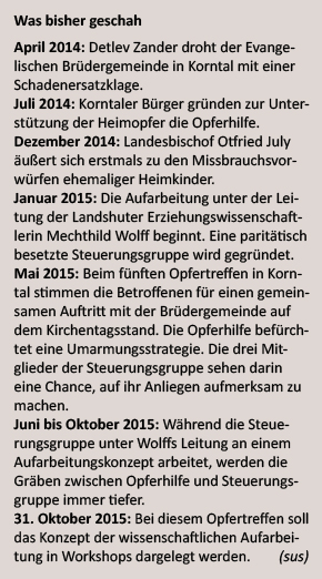 In den vergangenen fünf Monaten hat sich der Streit verselbstständigt, orchestriert durch emotionale Facebook-Ausfälle. Persönliche Scharmützel wurden zu Beleidigungen, führten zu Anzeigen und Denunziation. Der eine wurde beim Jobcenter angeschwärzt, der andere bei seinem Arbeitgeber. Opfertreffen wurde von der einen Gruppe anberaumt, von der anderen abgesagt oder nicht anerkannt, unliebsame Personen ausgeschlossen. Gemeinsame Beschlüsse gab es nicht mehr. Das muss geklärt werden. Schließlich wollte man einmal gemeinsam den Missbrauchsskandal in den Heimen der Evangelischen Brüdergemeinde in Korntal aufarbeiten.