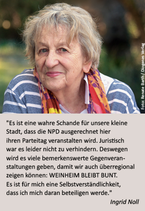 Oberbürgermeister Heiner Bernhard (SPD) will das braune Image loswerden: "Wir sind eine Stadt mit sehr durchmischter Kultur und großer Integrationskraft." Auch die Stadtverwaltung ist Teil des bunten Bündnisses. Ebenso wie etwa die örtlichen Kirchen, Gewerkschaften, der AK Asyl oder die im Gemeinderat vertretenen Fraktionen. Die Initiatoren rechnen mit bis zu 5000 Gästen aus aller Welt – das entspricht in etwa der Mitgliederzahl der NPD. Weinheim ist gewappnet. Eine Schlappe wie vor einem Jahr soll es nicht mehr geben. Damals hatte der Oberbürgermeister auf eigene Faust versucht, die NPD aus der Stadt fernzuhalten.