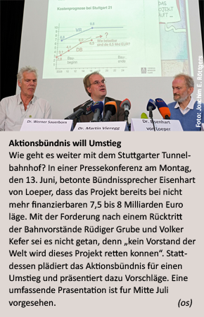 Nun sind die Kostenentwicklungen bei Stuttgart 21 bekannt, die wundersame Entwicklung der Prognosen für den Bahnverkehr, konkret, die versprochenen Kapazitätssteigerungen des Tiefbahnhofs ebenso: Anfangs in den 1990er sollte der neue Bahnhof doppelt so viele Züge wie der alte abfertigen können, rund zehn Jahre später waren es noch 50 Prozent, ehe beim so genannten Stresstest im Juli 2011 der geplanten Station dann eine um 30 Prozent höhere Kapazität bescheinigt wurde. Ein Ergebnis, das aber schon bei der Präsentation in mehrfacher Hinsicht Zweifel aufwarf (siehe unter anderem die Kontext-Artikel "<link http: www.kontextwochenzeitung.de gesellschaft bissle-friede-1484.html internal-link-new-window>Bissle Friede" und "<link http: www.kontextwochenzeitung.de politik was-vom-spruche-uebrig-blieb-3216.html internal-link-new-window>Was vom Spruche blieb").