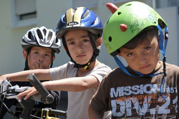 Draußen auf der Straße vor dem Hof saust eine Gruppe Kinder auf Fahrrädern vorbei. Alle mit Helm.