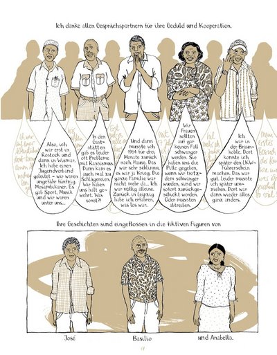 Die "Madgermanes"-Protagonisten Anabella, José und Basilio allerdings sind keine realen, sondern fiktive Figuren, ihre Biografien sind kondensiert aus der Summe der Gespräche, die Weyhe führte. Eine Vorgehensweise, die erst im Zuge der Recherchen entstand, denn ursprünglich wollte Weyhe einen Reportage-Comic aus den Interviews machen. "Die ersten vier Interviewpartner hatten aber sehr ähnliche Geschichten zu erzählen, die wenig Variation boten", so Weyhe, weswegen sie weiter recherchierte. Dabei stellte sie fest, dass sich die Gespräche nicht nur zwischen den nach Mosambik zurückgekehrten und den in Deutschland gebliebenen Arbeitern stark unterschieden, sondern sich zudem bestimmte wiederkehrende Merkmale in den Erzählungen zeigten. Im Buch gebe es nun "den wütenden und unangepassten Kämpfer, Basilio, der für die Madgermanes in Maputo steht", erzählt Weyhe, während sich "der passive, schicksalergebene und etwas resignierte José hauptsächlich aus meinen Pemba-Interviews zusammensetzt. Die ambitionierte Anabella wiederum hat ihren Paten in den in Deutschland verbliebenen Vertragsarbeitern."