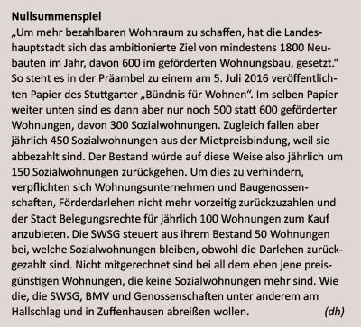 Ziel ist offenbar, schneller höhere Mieteinnahmen zu erzielen, als dies bei Bestandsbauten möglich wäre, wo die Mieten nur begrenzt angehoben werden dürfen. So verfährt die SWSG auch anderswo. In Zuffenhausen etwa sollen in der Keltersiedlung 105 Wohnungen der Abrissbirne zum Opfer fallen, weitere 46 in der Fürfeldstraße, wo nur 34 Neubauwohnungen geplant sind, davon ganze 11 Sozialwohnungen.