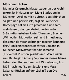 Es ist ein Un-Ort, wie es ihn in großen Städten viele gibt. Eine Transit-Zone, nicht nutzbar für die Stadtbewohner, fast nur für Autos, und das auch noch zweistöckig. Ein Musterbeispiel für das, was die MitgliederInnen der Initiative Stadtlücken suchen: Soziale, zeitliche, räumliche, bauliche Lücken, die nicht benutzt werden können, dürfen oder wollen. Um sie zu schließen.