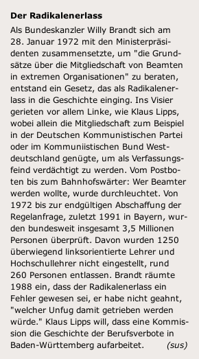 Da ist zum Beispiel der Mann aus dem Kultusministerium, dessen Nachname wohlziseliert und ohne Vornamen unter vielen amtlichen Schreiben stand, die mit dürren Worte das Ende mancher Lehrerkarriere bedeuteten. Sie lauteten so oder so ähnlich: "Das Kultusministerium ... hält ebenfalls die Zweifel an der Verfassungstreue ... nicht für ausgeräumt. Es wird gebeten, den Antrag auf Einstellung in den Schuldienst abzulehnen." Darunter stand nüchtern-kalt nur ein Wort: Ziegler. Der Mann ohne Vornamen, dessen Unterschrift Leben verändern konnte, war im Kultusministerium in Stuttgart verantwortlich für Beamtenrecht und hat schon unter Roman Herzog gedient. In mühevoller Kleinarbeit haben Lipps und sein Mitstreiter Lothar Letsche jenen Ziegler in Vaihingen ausfindig gemacht. Ob er ihn heute treffen, ihn konfrontieren will, 45 Jahre danach? Lipps schüttelt den Kopf. "Was soll das bringen? Der ist heute ein alter Mann."