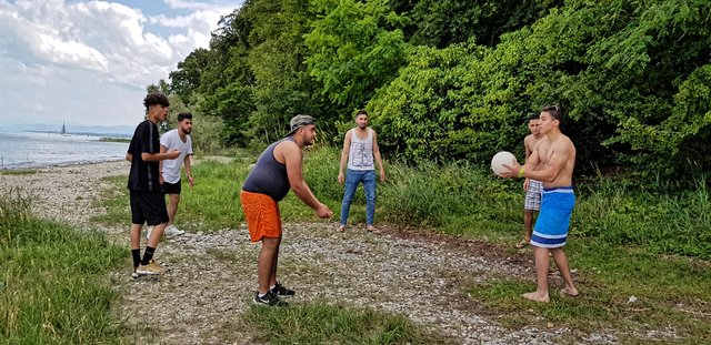 Der Grillplatz ist keine zehn Minuten entfernt vom Fähranleger, das Wasser fast warm, bloß der Strand ist etwas steinig. Mahamoud stakst wie auf Eiern über die Kiesel, die stylischen Sneakers in der Hand statt am Fuß, "damit sie nicht dreckig werden", erklärt er, und jammert bei jedem Schritt: "Aua ... aua ... aua."