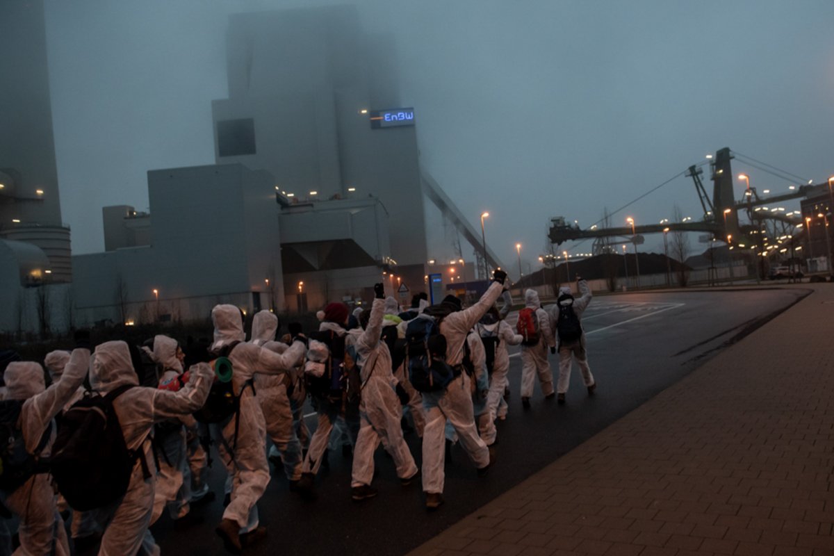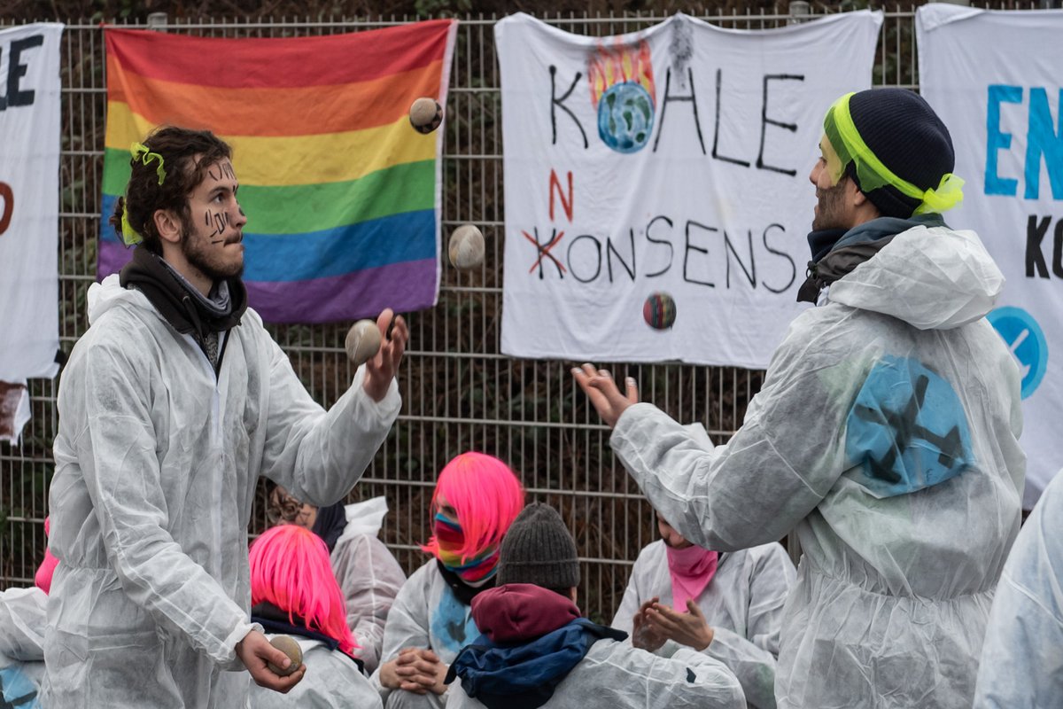 Alle sind verwirrt. Dann steigt eine kleine Gleisparty: Auf den Schienen spielen ein paar das Gesellschaftsspiel "Kraftwerke besetzen". Es ist an den Klassiker "Risiko" angelehnt, bloß, dass man hier keine fremden Länder überfällt, sondern Energiekonzerne ärgert. Ein protesterprobter Animateur bringt einem kleineren Grüppchen eine Tanz-Choreografie bei: Nach dem Sidestep mit Wellenbewegung kommen Handspiegel und Schulterblick, Klatschen und Tüten packen, gefolgt von "Rainbow" und "Airplane" und schließlich der "Run!": Mit vorgehaltenem Zeigefinger gehen sie in die Hocke und bewegen sich in krabbenähnlichen Trippelschritten seitwärts. Das sorgt für viel Gelächter. Der linke Bundestagsabgeordnete aus Karlsruhe, Michel Brandt, ist als parlamentarischer Beobachter vor Ort und findet die Aktion sensationell: "Schön, dass 'Ende Gelände' uns hier in Baden-Württemberg beehrt."