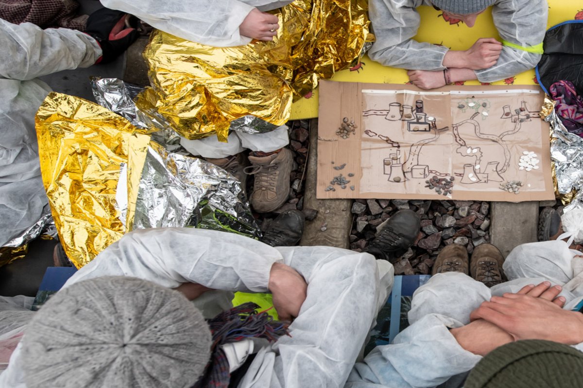 Während sich die muntere Truppe auf eine Konfrontation mit der Polizei vorbereitet hat, reagiert diese ganz anders als erwartet. Es dauert eine gute halbe Stunde, nachdem die ersten über den Werkszaun geklettert sind, bis sich herumspricht: vier Streifenwagen sind unterwegs. "Wie süß", kommentiert eine spöttisch, die fest entschlossen ist, die Gleise weiterhin zu blockieren. Als die ersten Beamten eintreffen, ist die Situation chaotisch und widersprüchliche Aussagen sind zu hören. Ein Polizist murmelt: "Da brauchen wir das SEK." Ein anderer teilt fast zeitgleich mit: "Wir wollen auf keinen Fall eskalieren". Dann, nach einer knappen Stunde, ziehen die Beamten wieder ab und teilen den verdutzten 50 Menschen auf dem Gleisbett lapidar mit: "Ihr könnt erst einmal hier bleiben."