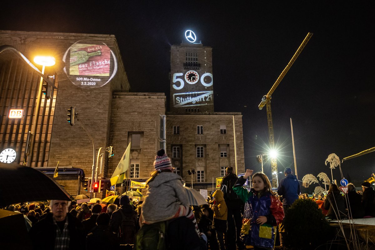 Also wird viel gelacht an diesem Abend, der eigentlich zum Weinen ist. "Wir berauschen uns nicht an unserem Durchhaltevermögen", sagt Moderatorin Angelika Linckh vor dem inzwischen zur Gänze und noch für Jahre stillgelegten Bonatzbau, "sondern wir sind gegen Verkehrswende-Verhinderungspolitik und die Flasche unter dem Bahnhof." Die Flasche und ihr Hals sind das Symbol des Abends, zuerst mit etwa 3.000 Menschen auf dem Arnulf-Klett-Platz, vielen bekannten Gesichter und dem obligatorischen Verkehrschaos in der Innenstadt. Angelika Linckh, die schon auf so vielen Demos aufgetreten ist, nahm Winfried Kretschmanns Steilvorlage auf. Der so oft und so scharf kritisierte Grüne hatte den Konflikt um Stuttgart 21 als "befriedet" eingeschätzt. "Wir waren immer friedlich und mussten uns von gewalttätigen Regierungen mit Wasserwerfern, Schlagstöcken und Pfefferspray bekämpfen lassen, weil wir für die grüne Lunge in der Stadt auf die Straße gegangen sind." Befriedet sei gar nichts, ganz im Gegenteil.