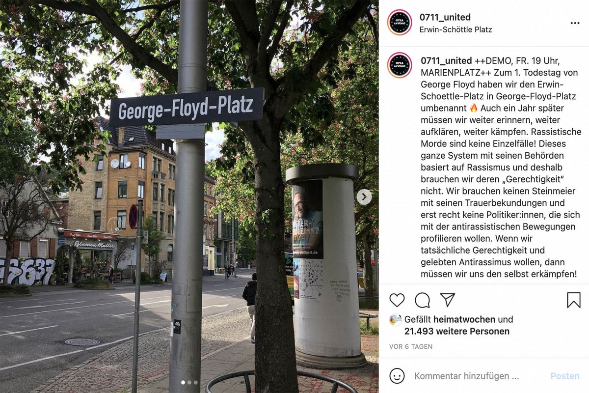 Der George-Floyd-Platz sollte das Gedenken sichtbar machen. Ein Jahr nachdem der Afroamerikaner in Minneapolis von einem Polizisten ermordet wurde, setzte eine globale Protestbewegung Zeichen gegen Rassismus. In Stuttgart hatten AktivistInnen den Erwin-Schoettle-Platz im Süden der Stadt mit selbstgemachten Straßenschildern vorübergehend umbenannt. Verantwortlich ist das Bündnis "0711 united against racism", das zum Todestag Floyds erklärt: "Überall werden BPoC (Black and People of Color) verfolgt und unterdrückt. Immer wieder sterben Menschen – auch hier in Deutschland. Oury Jalloh, Christy Schwundeck, Amad Ahmad, Qosay Khalaf … und das sind nur die bekanntesten Fälle von tödlicher Polizeigewalt."