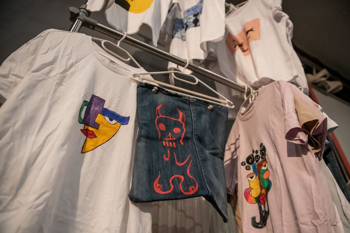Mit Hilfe eines Schwamms verdichten sich kunterbunte Farbtupfer zu himmelblauen, wiesengrünen oder zitronengelben Grundierungen. Auf den Textilien, die heute neu gestaltet werden, haben Workshop-Beteiligte mit Kreppband Rechtecke abgeklebt, damit die Ränder sauber bleiben. Leiterin Atish, die ihren Nachnamen ungern in der Zeitung lesen würde, schaut den Teilnehmer:innen über die Schultern, gibt Tipps – "Das sollte noch etwas trocknen, bevor du es übermalen kannst" –, sie skizziert mit Bleistift Figuren auf T-Shirts oder ritzt mit einem kleinen Messer Rillen in die noch nicht getrocknete Farbmasse. Das Ganze hat etwas Meditatives.