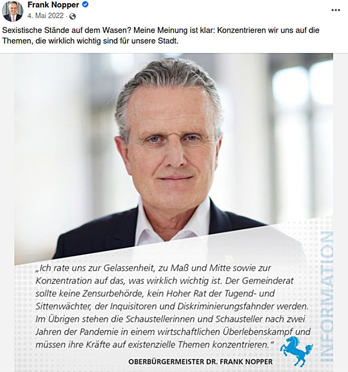 "Mit seinem Post verfolgt Nopper die Strategie, Scheininhalte aufzubauen, um eine inhaltliche Diskussion zu verhindern", ordnet Olaf Kramer auf Kontext-Anfrage ein. Der Professor für Rhetorik und Wissenskommunikation an der Eberhard Karls Universität Tübingen hat sich die rhetorische Taktik dieser Kommunikation angesehen. "In Wirklichkeit kann man über das Gendern sprechen und über die wirtschaftliche Not der Schausteller:innen", erklärt er weiter, das eine schließe das andere nicht aus. Außerdem nutze Nopper stark emotional aufgeladene Begriffe, die Zusammenhänge sehen, wo nicht notwendigerweise welche sind. "Das Sprechen über Genderfragen macht den Gemeinderat nicht automatisch zur 'Zensurbehörde'". Fazit: ein Post, der nicht einordnen, sondern polarisieren will. (lui)