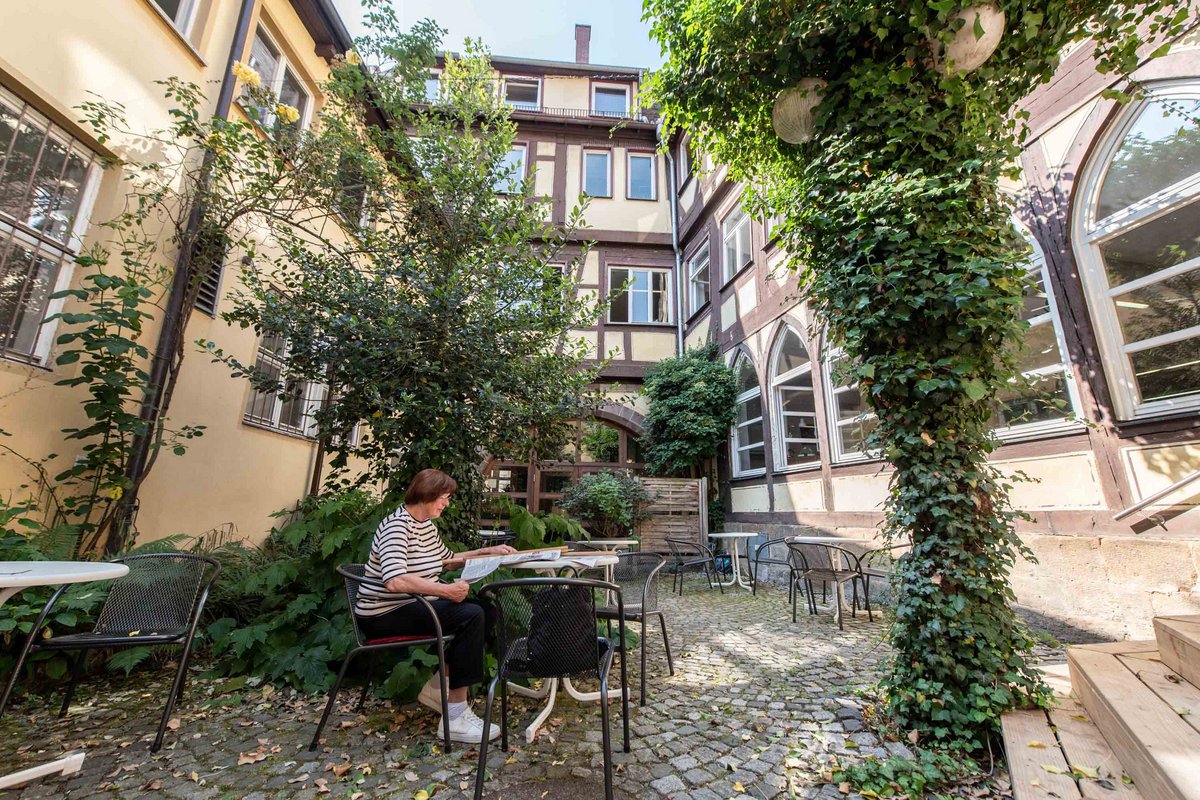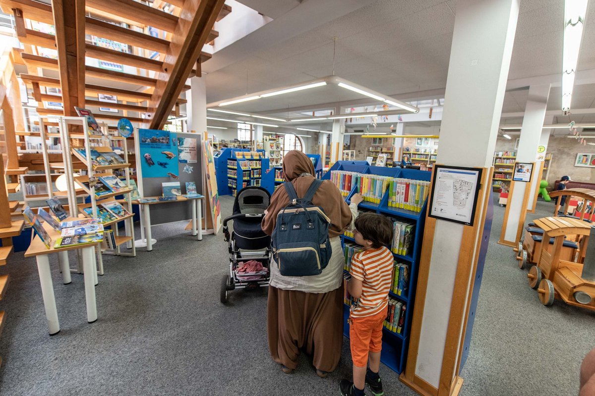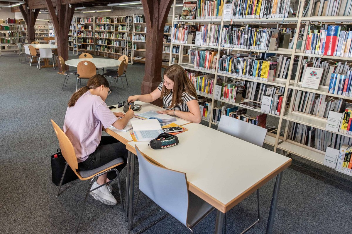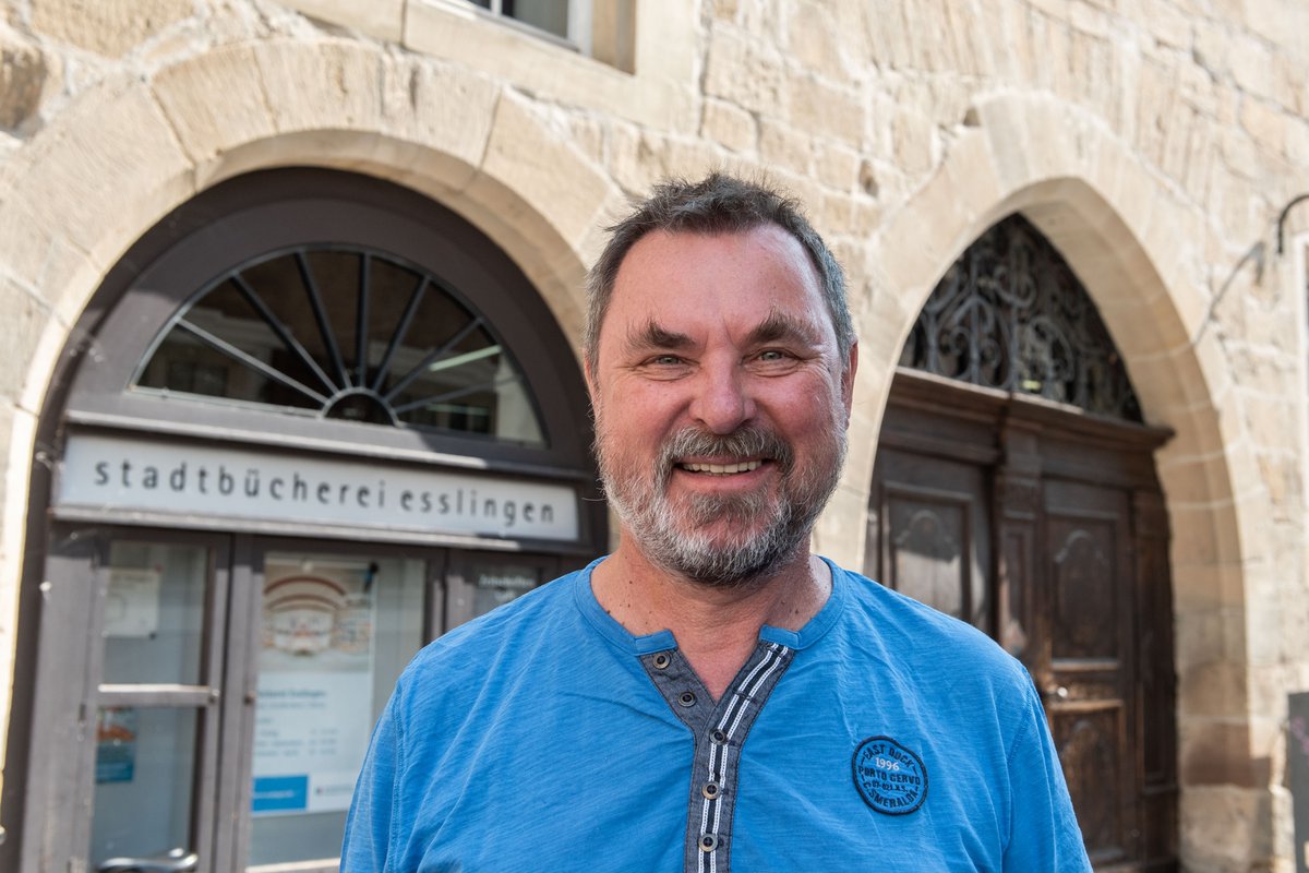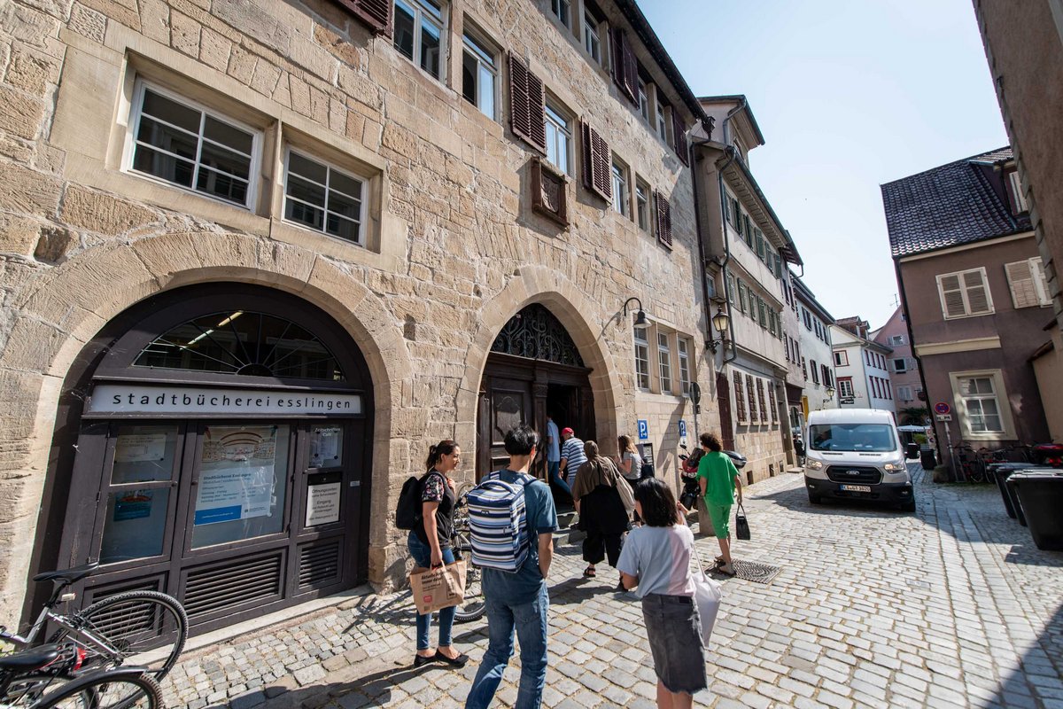 Mittwoch, kurz vor 10 Uhr in der Esslinger Altstadt: 15 Besucher:innen warten bereits vor der Bibliothek, die gleich ihre Pforten öffnet. Ansonsten ist es ruhig, denn es sind Schulferien. Tische und Stühle stehen zwischen den Regalen und die seien in Unterrichtszeiten oft alle besetzt, sagt Hermann Beck. Kinder und Jugendliche müssten dann auf den Treppenstufen Platz nehmen.