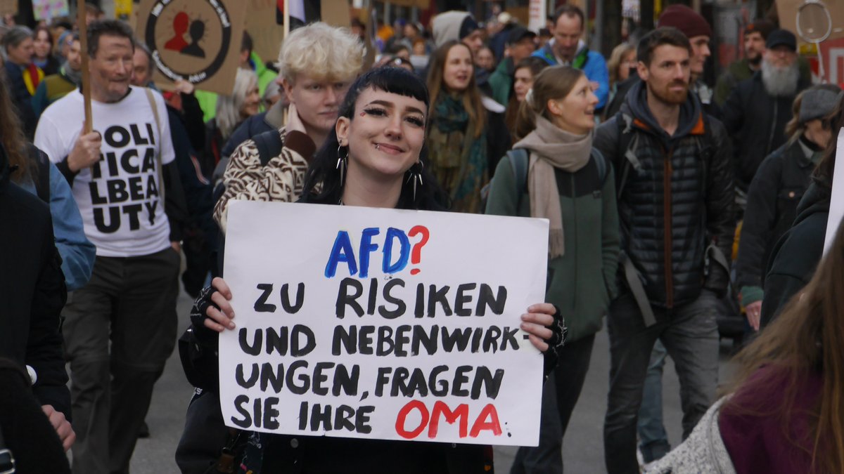 Wieder ist es die junge Generation, die zahlenmäßig überwiegt, das Grau der Älteren auffrischt und muntere Transparente ("Lillifee statt AfD") schwingt. Der Ordnung halber seien aber auch betagtere Demonstrant:innen erwähnt, die Schilder mit schwereren Aussagen trugen: "Wir errichten und erhalten Brandmauern, Herr Merz. Das Handwerk".