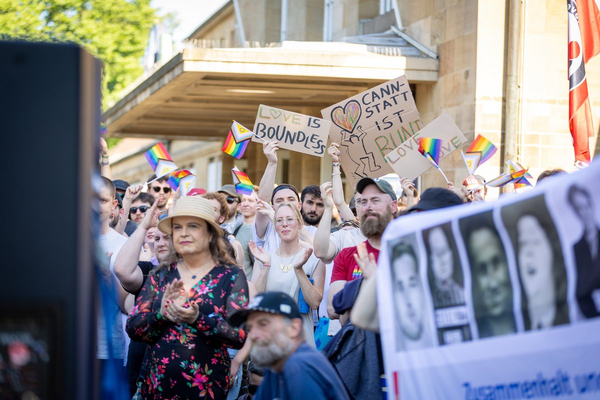 Sie hätten die "größte Pride-Flagge gekauft, die im Handel erhältlich ist", verkündet Moderatorin Charlotte von Bonin freudestrahlend auf der Bühne auf dem Cannstatter Bahnhofsvorplatz. Etwa 250 größtenteils junge Menschen haben sich hier mit bunten Fahnen und kreativen Plakaten versammelt, um nach rechtsextremen Angriffen auf das Kulturzentrum Prisma klarzumachen: "Wir sind hier, wir bleiben da, wir sind queere Antifa!" Ein größeres Transparent erteilt Nazis Cannstatt-Verbot.