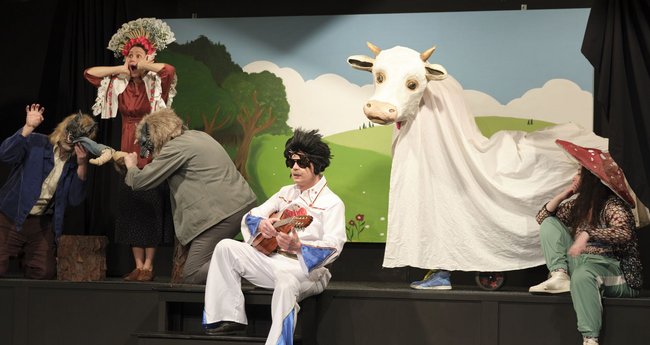 Herrliches Bild: Katzentisch mit Kinderstuhl ... Winne Hermann als Kaschperle von Kretschmann ("das kann jetzt »mein Verkehrsminister« sagen ...") Daneben Nopper, frisch gegelt mit rosa Kavalierstuch, die "ursüdtiroler" Blondine Palla...