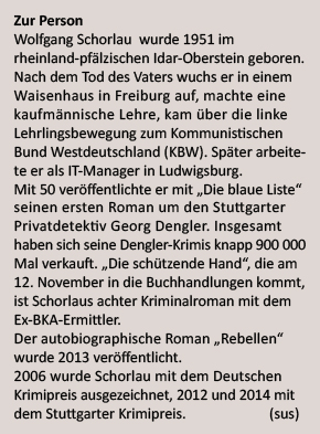 Der 64-Jährige hat eine harte Zeit hinter sich. In seinem neuesten Politthriller hat der Kriminalschriftsteller seinen Privatermittler Dengler in ein Haifischbecken geworfen, in dem die Haie ziemlich real und noch sehr lebendig sind. Er lässt den Stuttgarter Ex-BKA-ler zum "Nationalsozialistischen Untergrund", kurz NSU, ermitteln, während in München noch der Prozess gegen Beate Zschäpe läuft und in hessischen, nordrhein-westfälischen und baden-württembergischen Untersuchungsausschüssen versucht wird, die Wahrheit zum NSU-Komplex zu ermitteln. Am 12. November wird "Die schützende Hand" erscheinen.