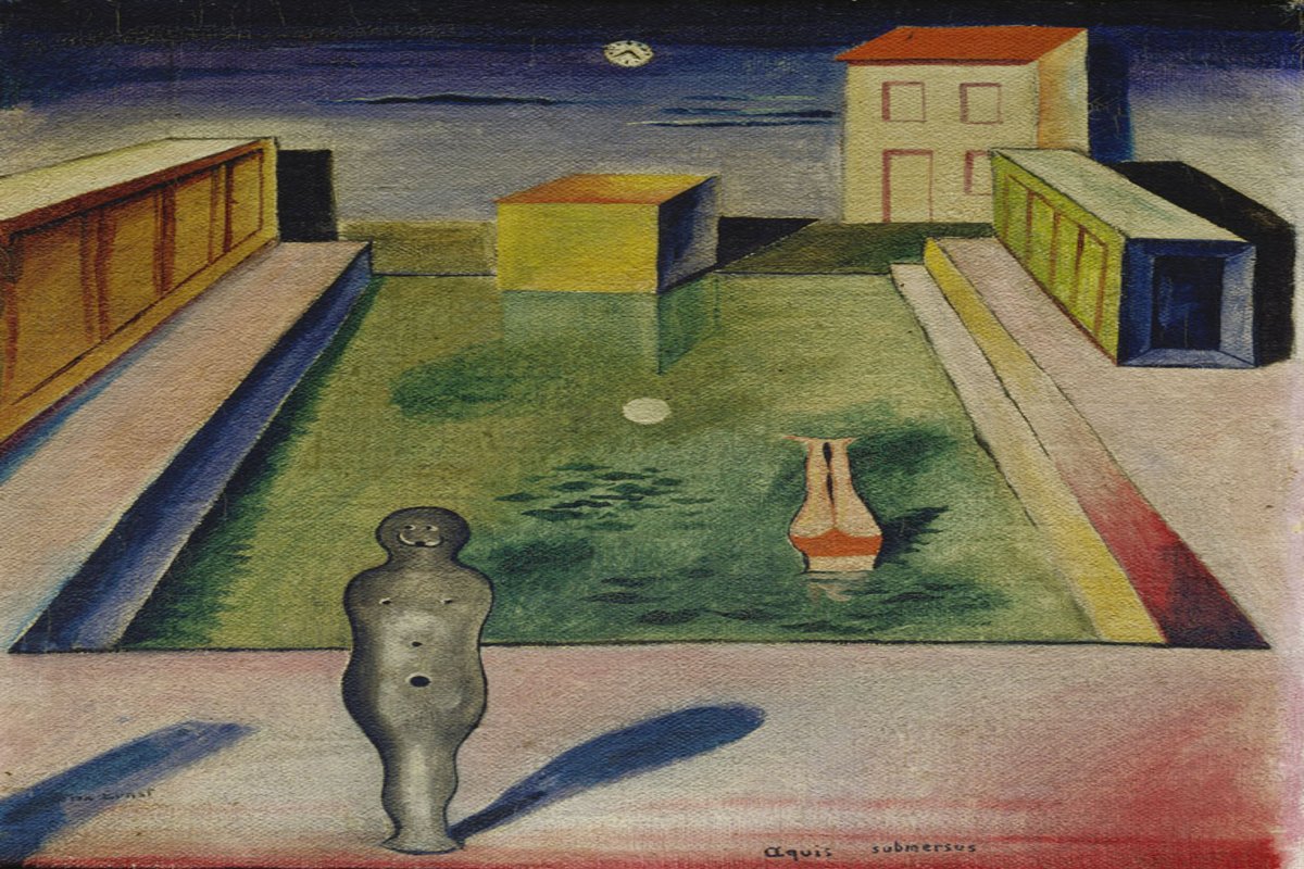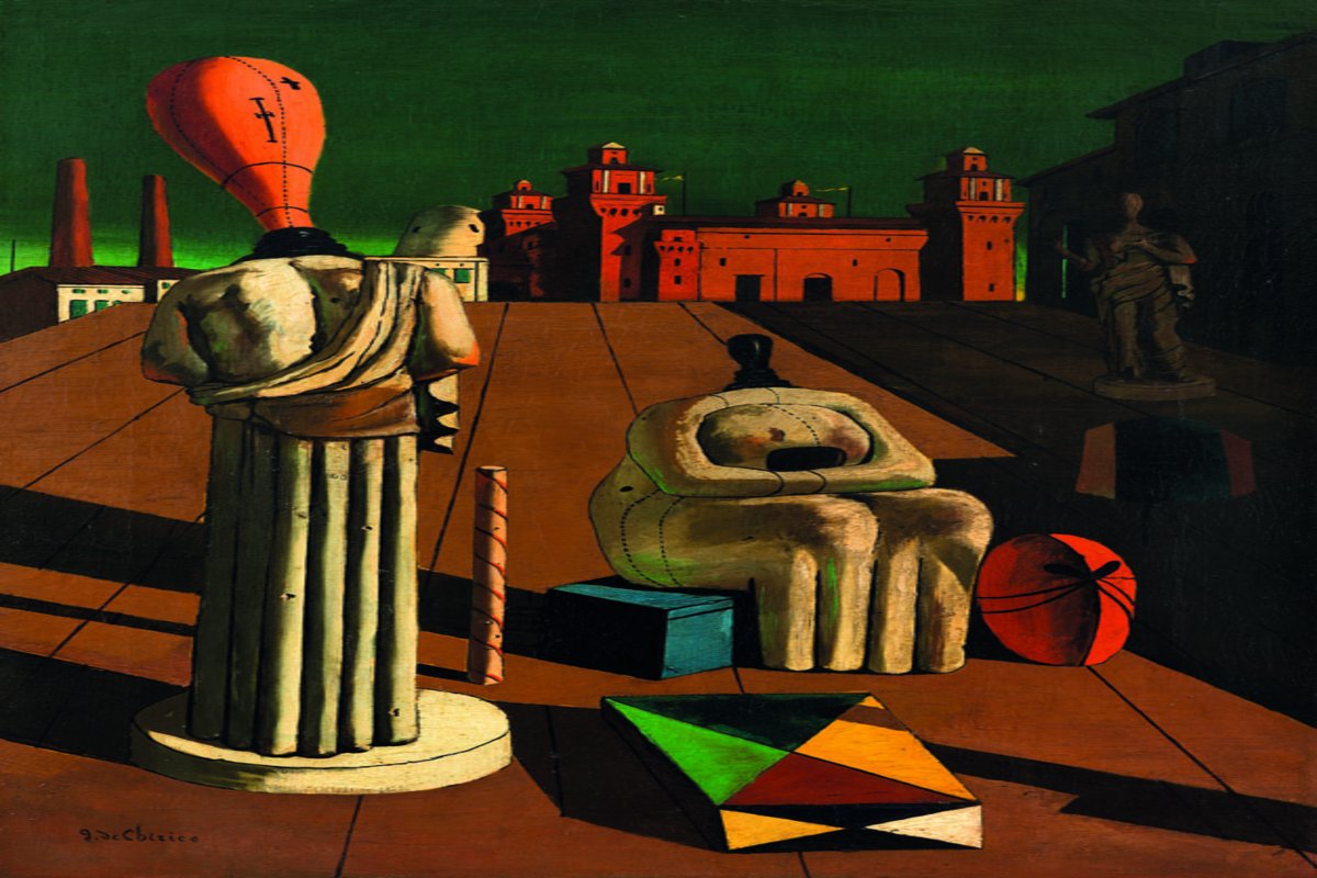 Ursprünglich von Arnold Böcklin und Max Klinger ausgehend, entwarf De Chirico ab 1909 seine berühmten leeren Plätze mit den schattigen Arkaden, den klassischen Denkmälern, den halb versteckten Segelschiffen und Eisenbahnen, den verlorenen Figuren und Schlagschatten. Es sind wie bei Klinger und Böcklin letztlich alles offene Symbole, die aber unter dem Eindruck des französischen Kubismus deutlich an Prägnanz und Klarheit gewonnen haben.