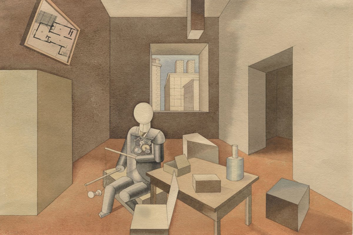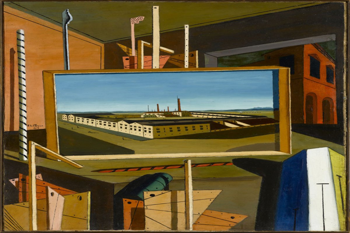 Eine Fabrik wie diese hatte es in der Geschichte der Kunst vorher nicht gegeben. Eine riesige Vierflügelanlage, an der hinteren Ecke eine Batterie von Schornsteinen, auf der Straße ein paar verlorene, winzige Menschenfigürchen. Aber Giorgio De Chirico malt vor 100 Jahren nicht nur eine Fabrik. Er malt ein Gemälde von einer Fabrik, das gerahmt in einem Innenraum steht, umgeben von einer Heerschar von Linealen, Stäben und Winkeln.