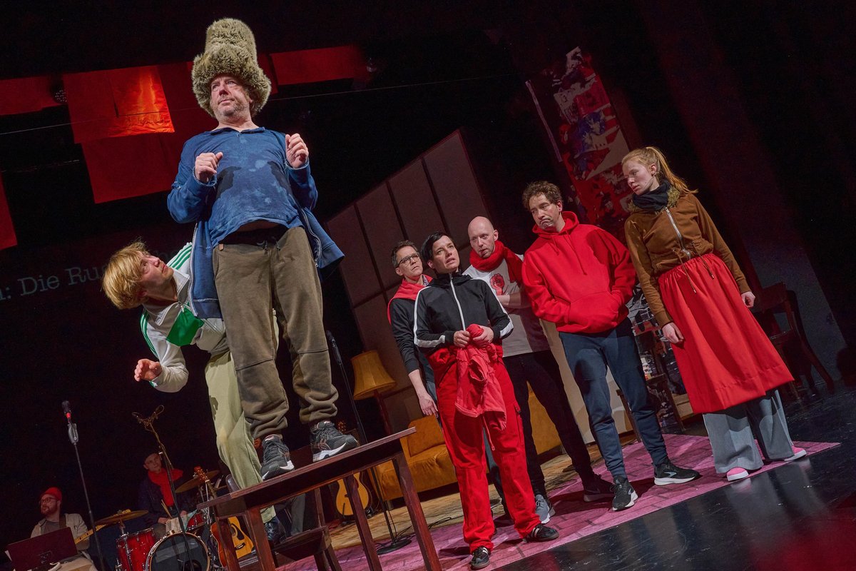 Entsprechend der Agitprop-Idee (ein Begriff zusammengesetzt aus Agitation und Propaganda) ging es natürlich auch in der Esslinger Premiere der "Proletenpassion" gut verständlich und vereinfacht zu. Botschaft und Erzählung werden in griffig verpackten Häppchen serviert. Das geschieht auf unterhaltende, abwechslungsreiche Weise: 34 (von ursprünglich 65) eingängige, rhythmisch oft treibende, politpoetisch getextete Lieder wechseln sich ab mit kurzen, thesenreichen Spielszenen, in denen der jeweilige Gegenstand satirisch oder ironisch auf den Punkt gebracht wird. Eine Politrevue in sechs Stationen, in der es im Schweinsgalopp durch die Geschichte der Revolutionen geht: von den deutschen Bauernkriegen zur französischen Revolution, von der Pariser Kommune zur Oktoberrevolution.