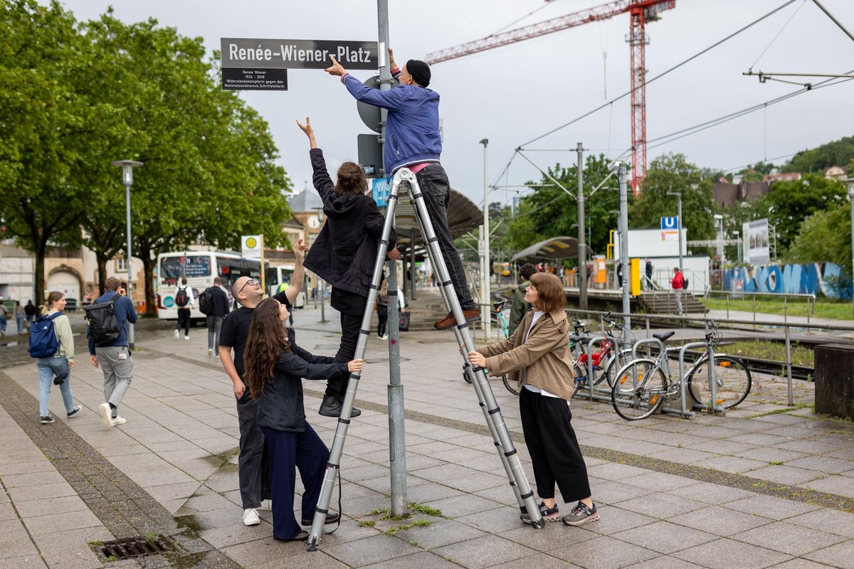 Diesen Montag, 2. Juni, ist nun der erwähnte Albert Lichtblau, Leiter des Fachbereichs Geschichte der Universität Salzburg, zum Wiener Platz gekommen, um über Renée Wiener zu sprechen. Diese Woche erhält der Ort sechs neue Namenspatron:innen mit Nachnamen Wiener. Eine "Orgie der Umbenennung" nennt das die Lokalwebsite "feuerbach.de". Doch ist Umbenennung überhaupt der richtige Begriff? Der Wiener Platz heißt weiterhin Wiener Platz, nur erweitert: "Renée-Wiener-Platz" steht seit Montag auf einem neuen Straßenschild.