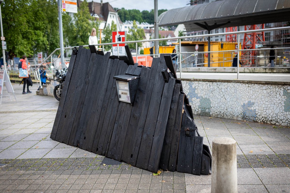 Der Wettbewerb stand unter dem Titel "Bunker.Resonanz". Unter der Stadtbahnhaltestelle befindet sich ein denkmalgeschützter Tiefbunker. "In seiner Anschaulichkeit und Gesamtheit ist er in Stuttgart singulär", so das Denkmalamt. "Der thematische und räumliche Schwerpunkt" des Wettbewerbs soll das Zugangsgebäude sein: ein unauffälliger, altrosa gestrichener Quader, im Moment beinahe unzugänglich. Derzeit auch am Wiener Platz zu sehen: Gestrichelte Linien in der altrosa Farbe des Bunker-Zugangshäuschens. Sie stammen aus einer Intervention des Teams "Nadelöhr" – damit ist der Eingang zum Schutzraum gemeint. Vor dem Bahnhof steht eine kleine Schutzhütte aus schwarz verkohltem Holz: Sie gehört zum Projekt "Shelter: survival methods to heal divides", das die Frage des Überlebens in die Zukunft projiziert.