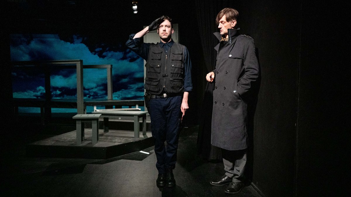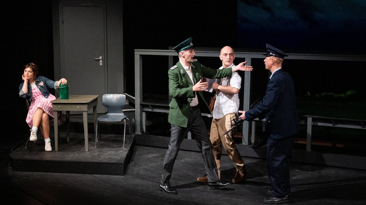 "Ohne Grenzen, ohne Grenzen gäb es keinen Staat und keine Ordnung in der Welt", singen die sieben Darsteller:innen schon vorab das Lied aus Horváths Schlussszene. "Wir tun von den Grenzen leben. Also muss es Grenzen geben." Und : "So ziehen wir die Konsequenz: Es lebe hoch die schöne Grenz!" "Wir" sind in diesem Fall die beiden Grenzwächter Thomas Szamek (Manuel Krstanovic) auf der einen und Konstantin (Philip Süs) auf der anderen Seite. "Grenzorgan" nennt Horváth die beiden. Er trennt zwischen Person und Funktion. "Dieses Grenzorgan ist ein fescher Mann mit einer schneidigen Uniform", beschreibt ein Ausrufer Konstantin vor seinem ersten Auftritt, "und er macht einen freundlichen Eindruck." Immer wieder steht mal rechts, mal links am Bühnenrand eine:r der Schauspieler:innen und kündigt an, was passiert, während die Drehbühne mal in die eine, mal in die andere Richtung gedreht wird. Konstantin mag freundlich sein, aber: "Gesetz ist Gesetz."