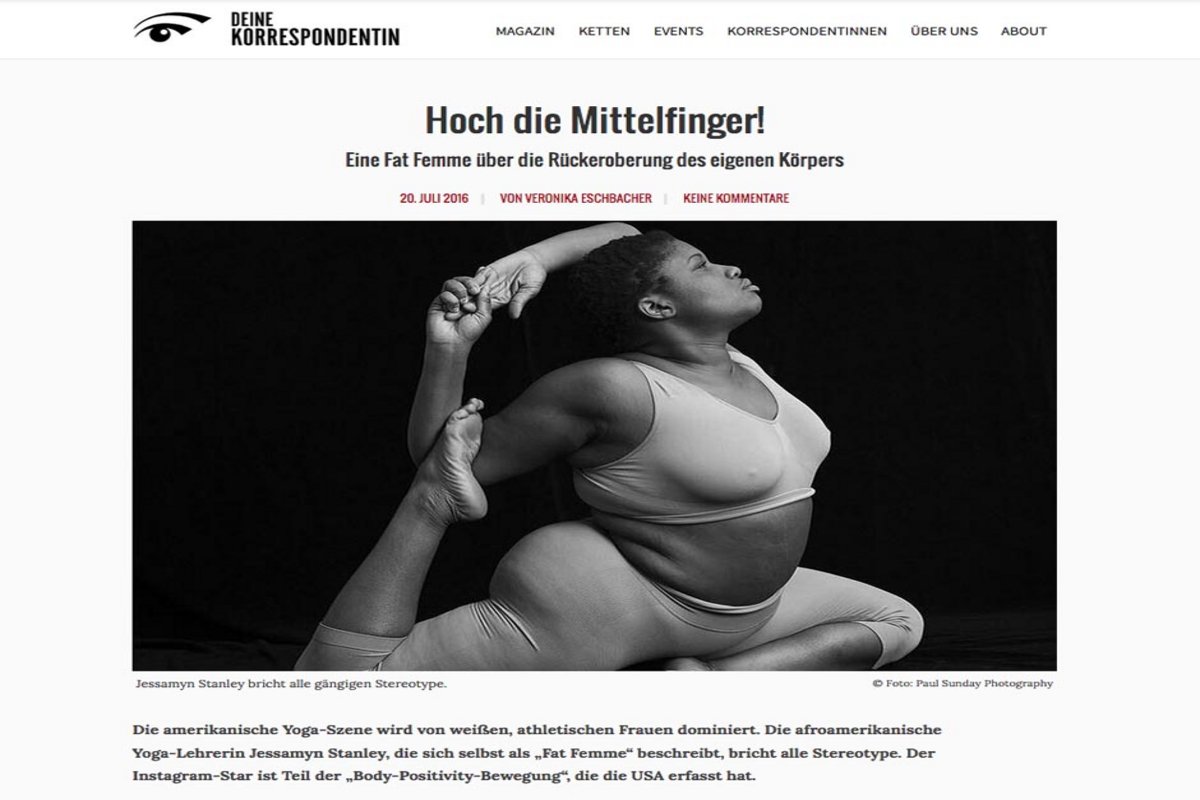 Veronika Eschbacher ist Korrespondentin für die USA und Afghanistan. Sie hat Jessamyn Stanley aus North Carolina getroffen, die unter lauter athletischen, weißen Frauen nicht nur als dicke, schwarze Yoga-Lehrerin unglaubliche Erfolge feiert, sondern auch mit Nacktbildern auf Instagram und Facebook. "Am unwohlsten fühlen sich Amerikaner, wenn sie Brüste und Vaginen sehen. Und um Himmels willen, es sollen schon gar keine Brüste oder eine Vagina einer Larger-body-Frau sein", sagt sie im Interview. Titel des Artikels: <link http: www.deine-korrespondentin.de hoch-die-mittelfingereine-fat-femme-ueber-die-rueckeroberung-des-eigenen-koerpers _blank external-link>"Hoch die Mittelfinger! Eine Fat Femme über die Rückeroberung des eigenen Körpers".