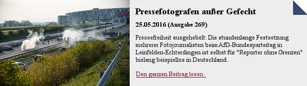 AfD-Parteitage sind offenbar gut für Premieren in der deutschen Pressegeschichte. Im vergangenen November schloss die Landespartei sämtliche Journalisten von ihrem Parteitag in Kehl aus. Das war so ungewöhnlich, dass sich nicht einmal Verfassungsrechtler einig waren, ob das nun widerrechtlich sei oder nicht. Und beim AfD-Bundesparteitag am 30. April in Leinfelden-Echterdingen nahm die Polizei teils bis zu zwölf Stunden lang mehrere Pressefotografen in Gewahrsam, die die Proteste gegen die Veranstaltung dokumentieren wollten. Weil sie zu diesem Zweck auch den Demonstranten über ein blockiertes Autobahnstück gefolgt waren, wurden sie wegen angeblicher Blockadebeteiligung festgesetzt, obwohl sie sich alle mit Presseausweisen als Journalisten ausweisen konnten. Als bislang beispiellosen Fall in Deutschland sah die Organisation Reporter ohne Grenzen eine derart lange Ingewahrsamnahme von Journalisten, und auch Siegfried Heim, für die Gewerkschaft Verdi Landesfachbereichsleiter Medien, nannte es eine "einmalige Geschichte".