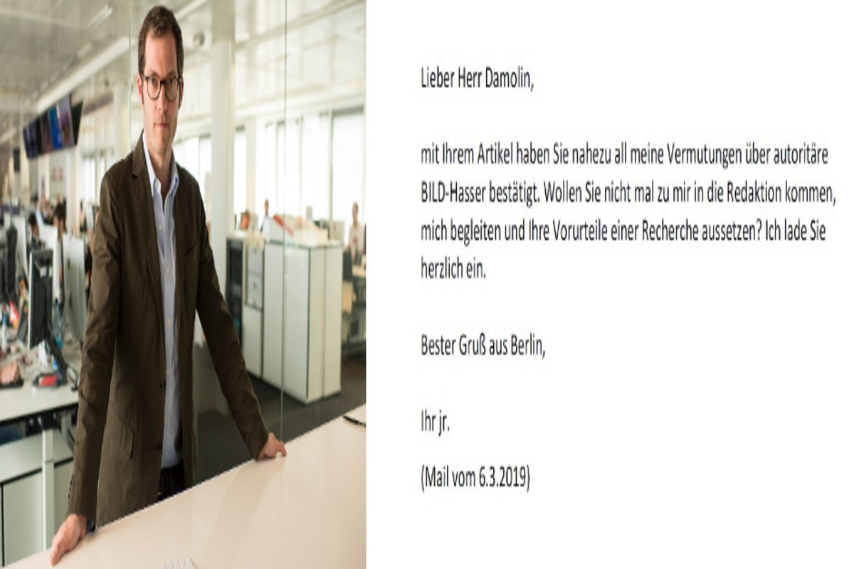 unverhofft kommt oft, so sagt man, doch völlig überrascht war ich, auf meinen Artikel <link https: www.kontextwochenzeitung.de medien bild-chef-im-delirium-5759.html _blank internal-link-new-window>"'Bild'-Chef im Delirium" (Kontext 6.3.2019) eine Mail aus der Berlin zu bekommen, vom Chefredakteur persönlich. Welch eine Ehre für einen, den Sie zuerst als "autoritärer BILD-Hasser" ansprechen und gleich anschließend in die Berliner Chefetage einladen, um seine "Vorurteile einer Recherche auszusetzen". Vielen herzlichen Dank.