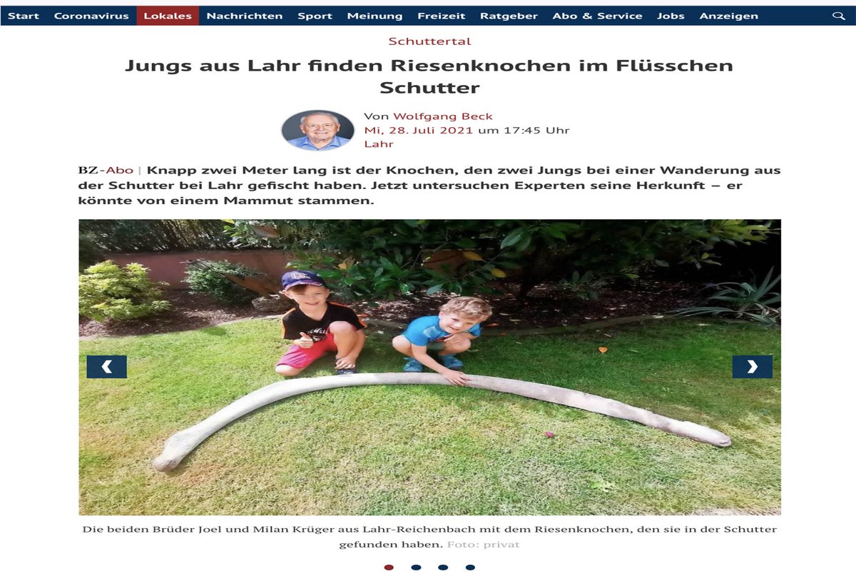 Zwei Jungs aus Lahr-Reichenbach im Badischen haben vor kurzem den Fund ihres Lebens gemacht. Es war Mitte Juni, Joél und Milan Krüger, acht und fünf Jahre alt, waren mitsamt Familie bei den Großeltern frühstücken, berichtete vergangenen Woche die "Badische Zeitung". Hernach, das gehört wohl zum Familien-Programm, war Schatzsuche am Flüsschen Schutter angesagt – hübsche Steine oder alte Münzen, doch plötzlich steckte da – ein Riesenknochen! Prachtvolle 1 Meter 80, hängengeblieben an einer Brücke. Der Onkel half, das Teil aus dem Wasser zu bergen, es wurde zu den Großeltern getragen, begutachtet, die Mutter meldete den Knochenfund dem Lahrer Stadtmuseum, das seinerseits auf das Landesamt für Denkmalpflege in Freiburg verwies, die Abteilung Operative Archäologie hatte schon einen Besuch der Fundstelle angekündigt, der Knochen himself sollte nach Konstanz verschickt werden, um weiter untersucht zu werden.