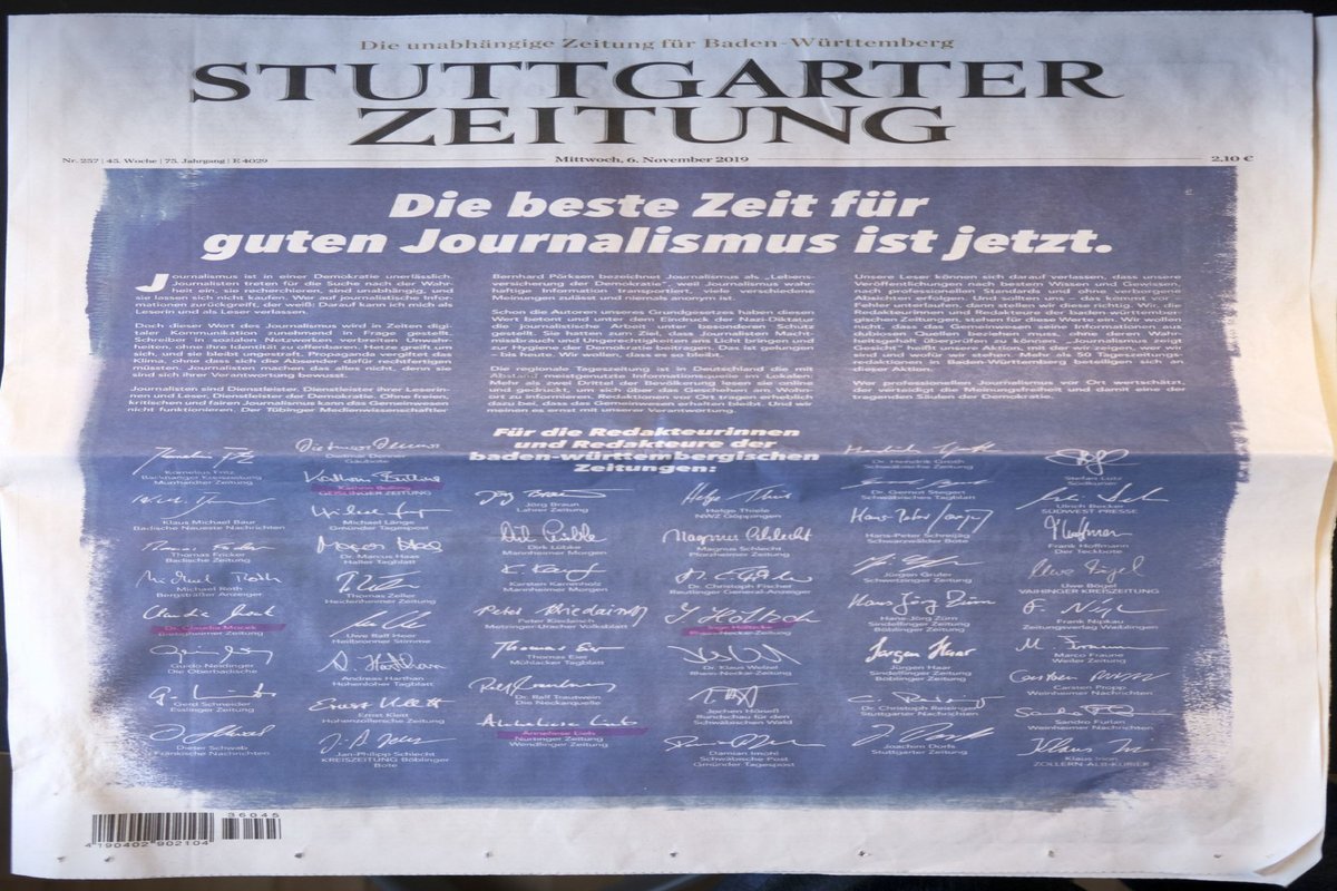 Vor zwei Jahren hatten die baden-württembergischen Verleger eine Idee. Der Journalismus müsse Gesicht zeigen, befanden sie und räumten am 6. November 2019 ihre Titelseiten frei, um zu versichern, dass sie unablässig für die Wahrheit und gegen die Lüge kämpften. Das sei in Zeiten von Fake News, Hetze und Rechtspopulismus besonders wichtig, meinte ihr Vorsitzender beim Verband Südwestdeutscher Zeitungsverleger (VSZV), Valdo Lehari jr., der von den Seinen als "leidenschaftlicher Kämpfer" für Pressefreiheit und Meinungsvielfalt gepriesen wird.