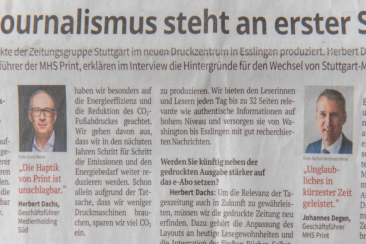 Sein Kollege Dachs will die gedruckte Zeitung sogar "neu erfinden", wobei es sein Geheimnis bleibt, wie er das bewerkstelligen will. Fest steht für ihn aber, dass sie Informationen "auf hohem Niveau" von Washington bis Esslingen bieten muss. Dazu noch die Haptik, also das Rascheln am Frühstückstisch, und "Print ist unschlagbar". Und weil das alles so super ist, fand sich die Beilage in der "Stuttgarter Zeitung" gleich in zweifacher Ausfertigung wieder.