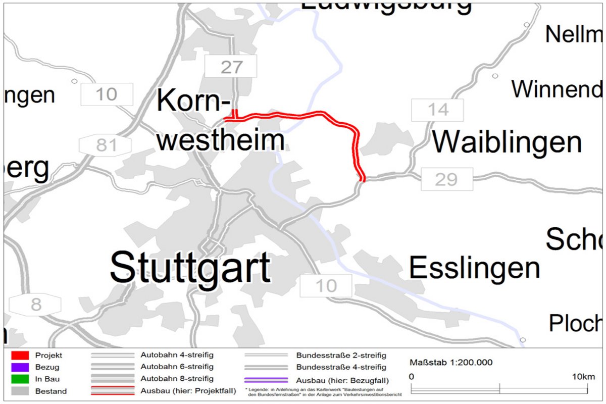 Das 11,5 Kilometer lange Straßenstück, das die B 27 bei Kornwestheim und die B 14 bei Waiblingen verbinden soll, schlummerte seit Jahrzehnten unter anderem wegen chronisches Geldmangels in der kaum realisierungsträchtigen Kategorie "weiterer Bedarf" in den untersten Schubladen der Straßenplaner. Nun steht es mit der Projektnummer B29-G990-BW eine entscheidende Stufe dringlicher ("weiterer Bedarf mit Planungsrecht") im BVWP-Entwurf, den Bundesverkehrsminister Alexander Dobrindt (CSU) drei Tage nach den Landtagswahlen im März veröffentlichte. Das Straßenstück, dessen Bau- und Planungskosten auf knapp 203 Millionen Euro taxiert werden, begründet <link http: www.bvwp-projekte.de strasse b29-g990-bw external-link-new-window>das Projektdossier als wirtschaftlich, sodass "mit der Planung unmittelbar begonnen werden kann". "Wir fordern das Land Baden-Württemberg auf, jetzt sein Planungsrecht wahrzunehmen und das Projekt bis zur Baureife weiter voranzutreiben", gab Pfeiffer postwendend Vollgas, obwohl der Bundestag erst im Herbst die endgültige Fassung des BVWP beschließen soll.